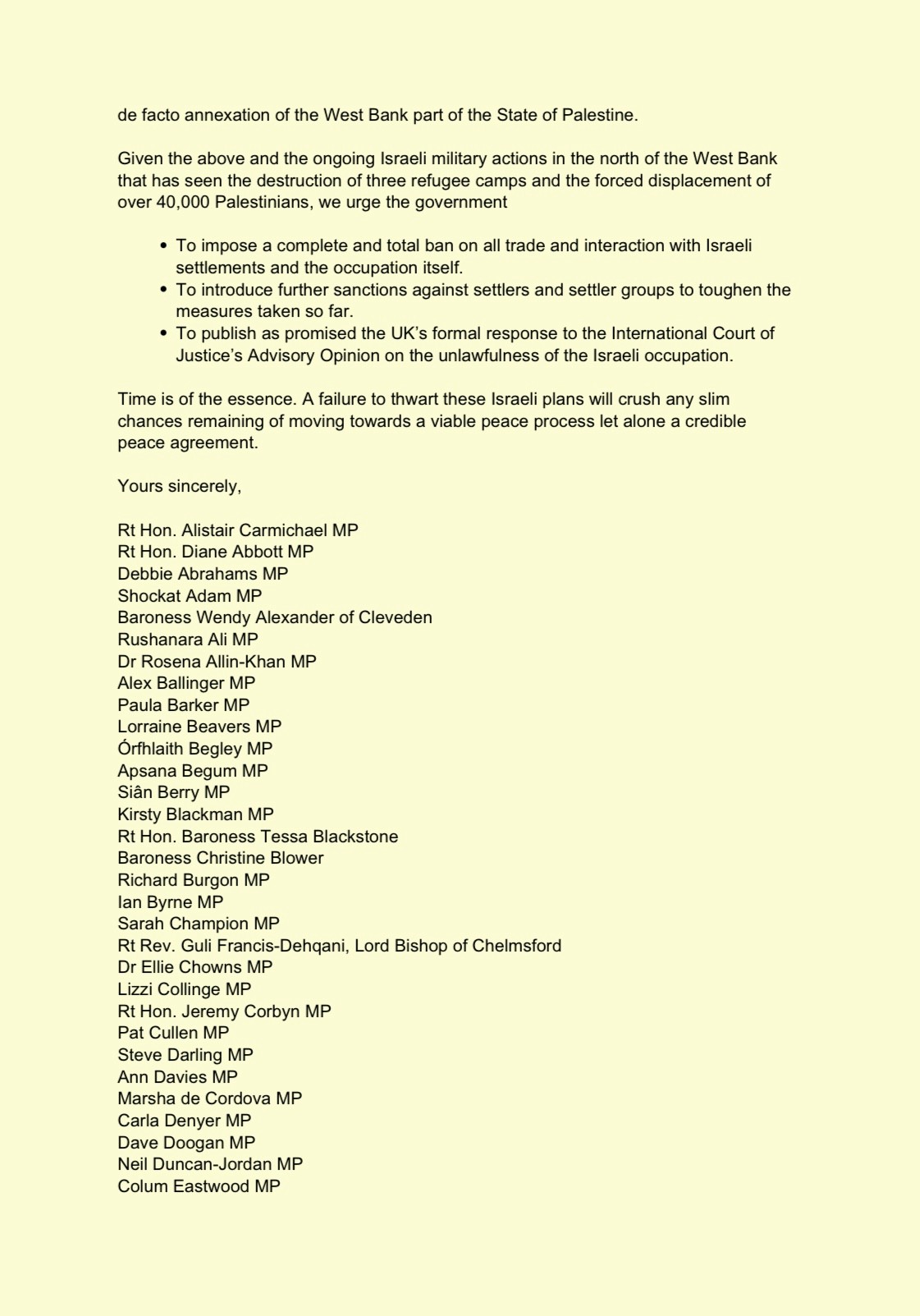 Following yet further illegal Israeli government measures in the West Bank part of the State of Palestine, we are writing to you as MPs and Peers to urge the government to move from statements of condemnation to specific sanctions to compel Israel to abide by international law and not destroy the state the UK recognised in September.